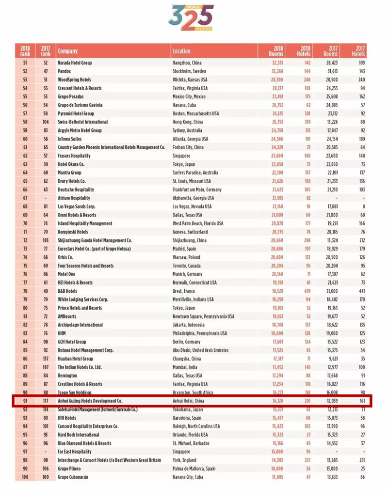 近日,酒店業國際權威雜志《HOTELS》發布了“全球酒店集團325強”(HOTELS 325)的最新排名,古井酒店成功躋身全球酒店集團百強榜單,名列91位,較上年提升26位。