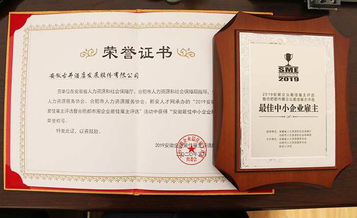 2020年4月,由安徽省人力資源和社會保障廳指導,新安人才網主辦的“2019安徽企業最佳雇主評選”活動結果揭曉,古井酒店憑借卓越的品牌形象、完善的人才培養機制和優秀的企業文化連續兩年榮獲“安徽省最佳中小企業雇主”稱號。